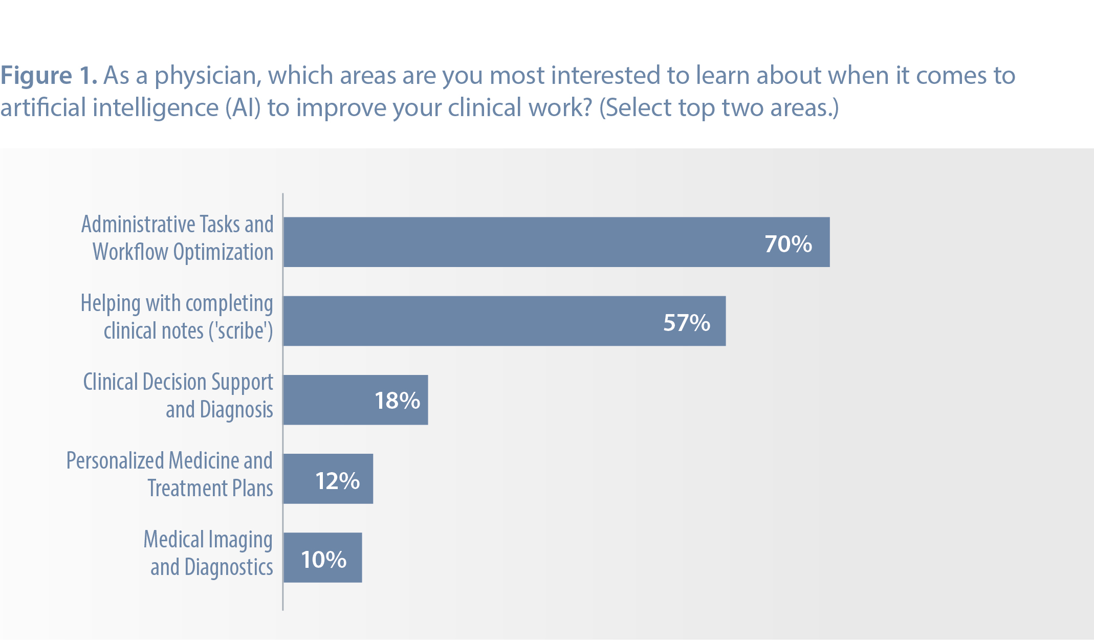 The second query asked “As a physician, which areas are you most interested to learn about when it comes to artificial intelligence (AI) to improve your clinical work? (Select top two areas.)” The top response at approximately 70% was “administrative tasks and workflow optimization” followed by about 57% saying “helping with completing clinical notes ('scribe').” Refer to Figure 1 for a full breakdown of responses.