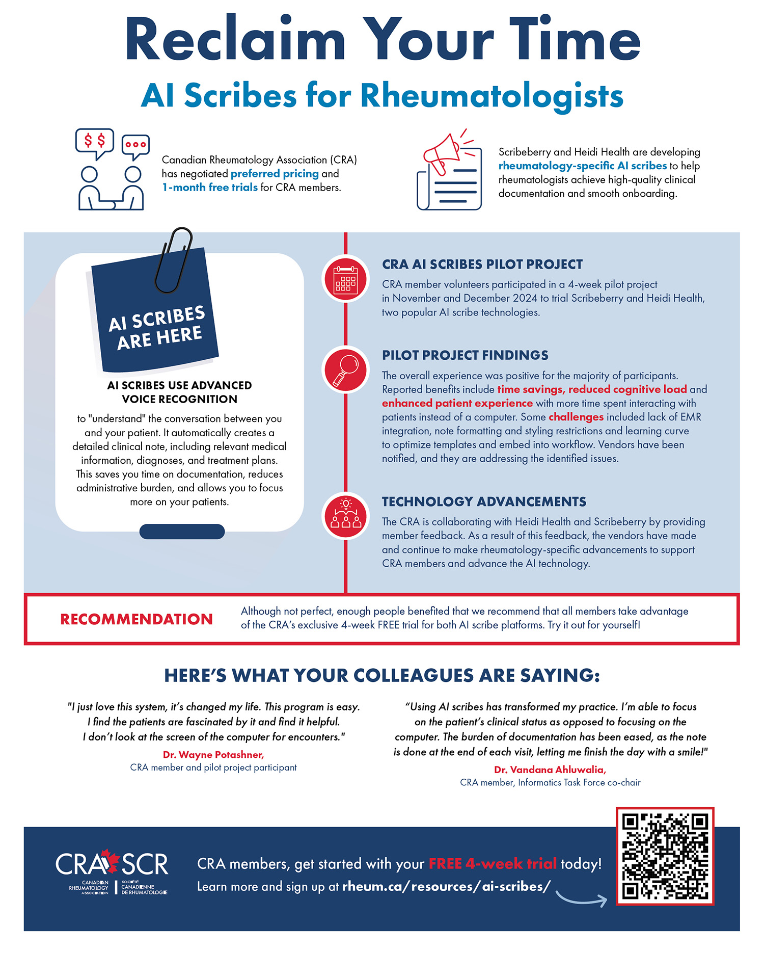 The access code to enter this site can be found on page 4 of the most recent issue of The Journal of the Canadian Rheumatology Association (CRAJ) or at the top of the most recent CRAJ email blast you received. Healthcare professionals can also obtain the access code by sending an email to CRAJwebmaster@sta.ca.