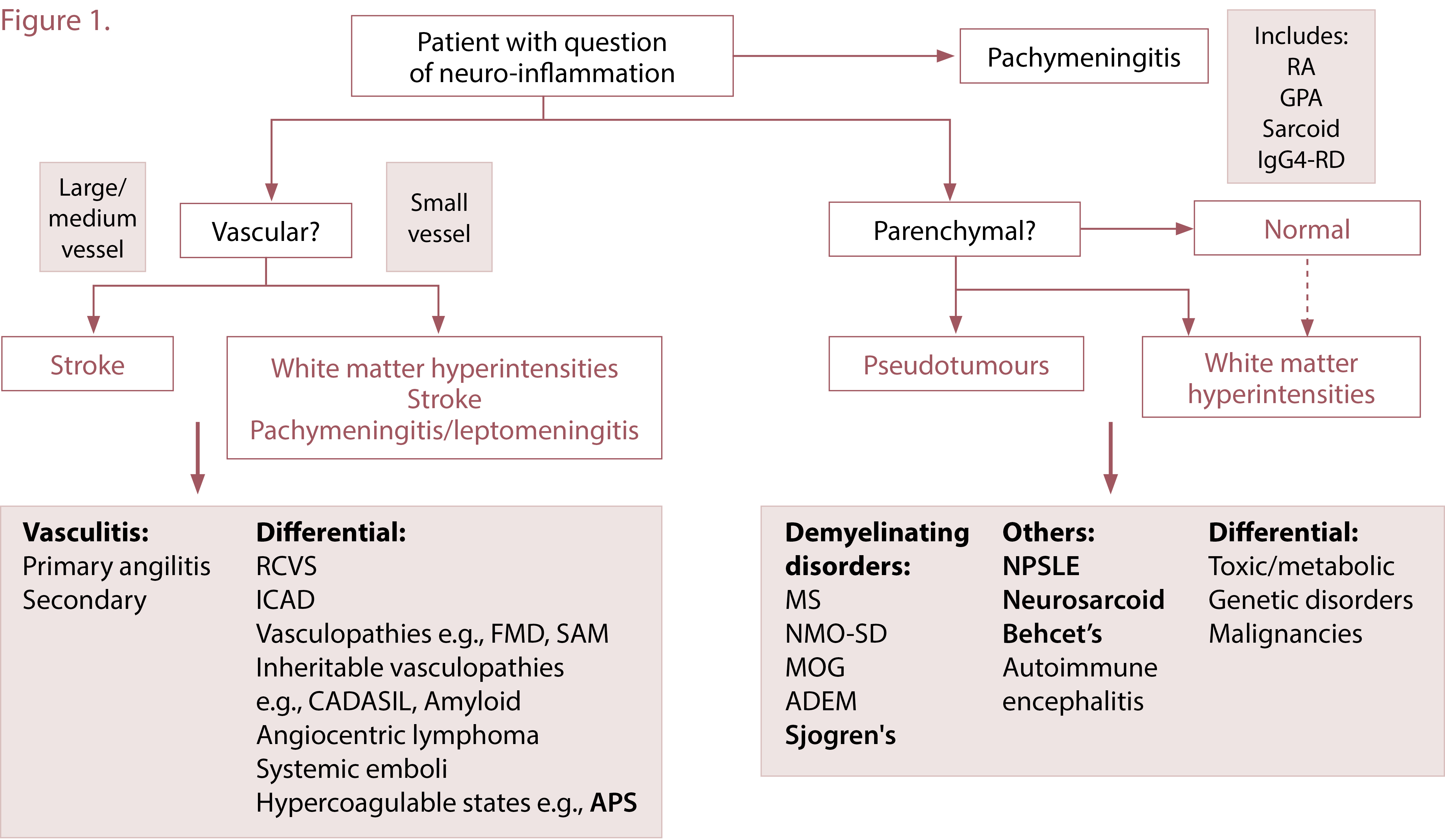 2) Develop a differential diagnosis based on the location of the potential neuroinflammation, considering non-inflammatory and inflammatory pathologies: The differential diagnosis for the appearance of inflammation in each of these locations is outlined in figure 1.
