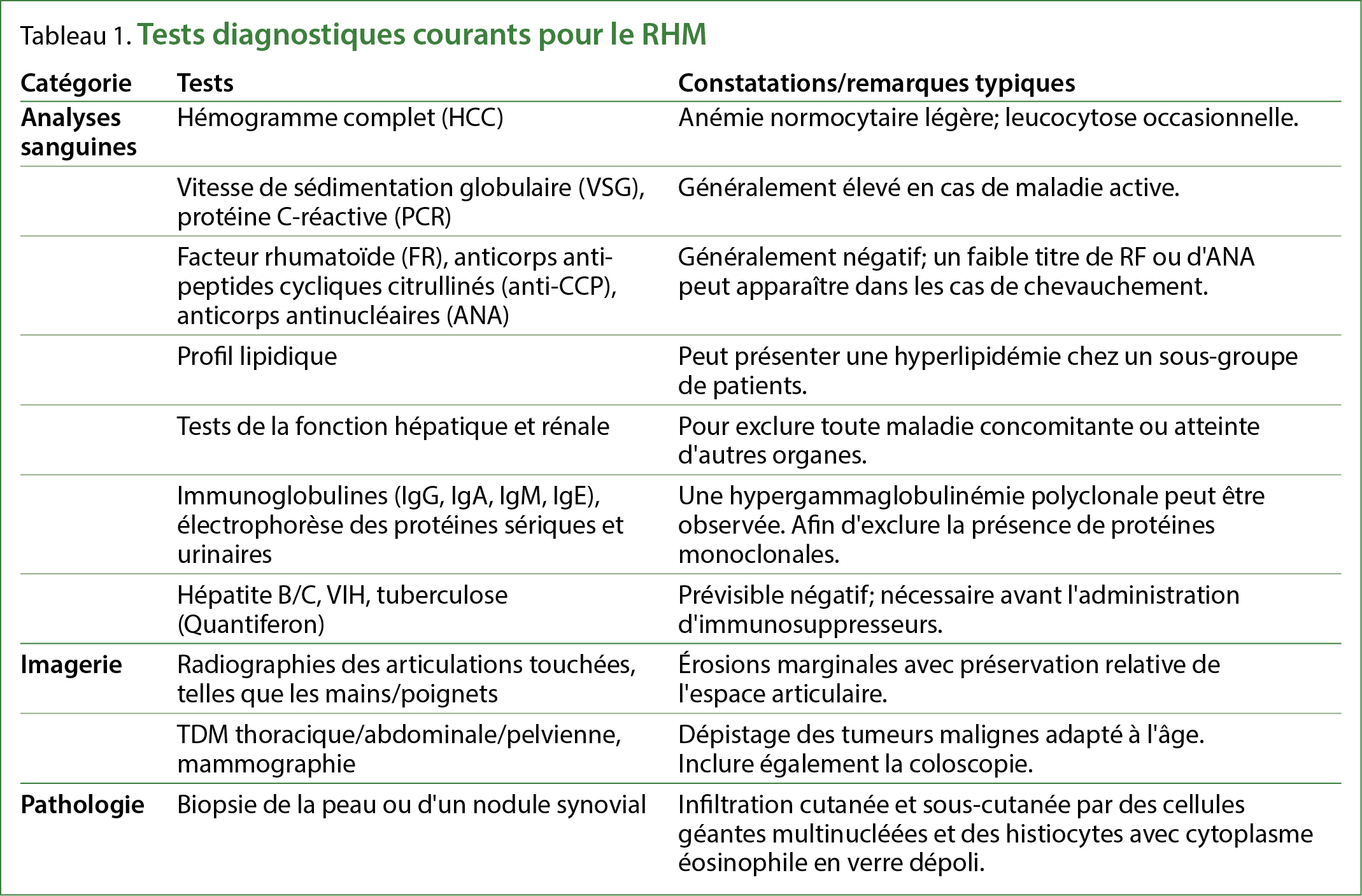 En cas de suspicion de RHM, les tests diagnostiques présentés dans le tableau 1 doivent être envisagés.