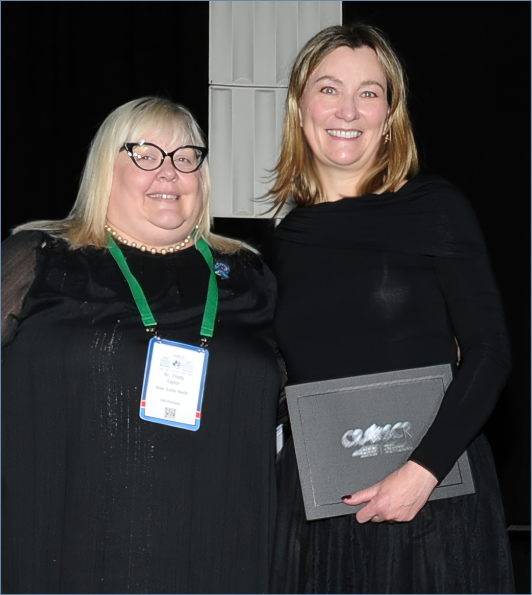 La Dre Dana Jerome reçoit son prix des mains de la présidente de la SCR, la Dre Trudy Taylor, lors de l’Assemblée scientifique annuelle de la SCR qui s’est tenue à Calgary en février 2025.